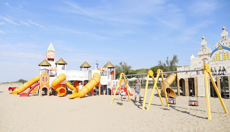 Vanaf uw accommodatie op camping Sant Angelo wandelt u zó het brede privéstrand op. De zee is rustig en loopt langzaam af – ideaal voor kinderen. Geniet van ligbedden, parasols, sportvelden, speeltoestellen en een gezellige beach bar. Ook kunt u hier diverse watersporten beoefenen. Genieten zonder grenzen!